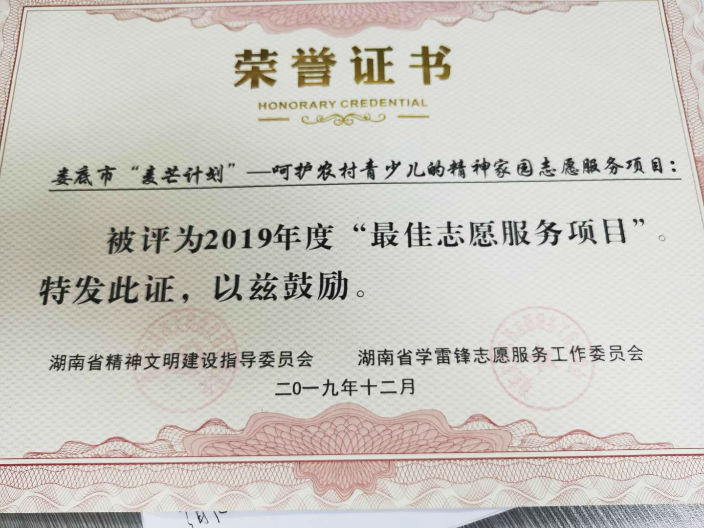 8月20日,湖南省宣传部、文明委、志工委对2019年学雷锋志愿服务先进典型进行了表彰。此次表彰对象分为“最美志愿者”、“最佳志愿服务组织”、 “最佳志愿服务项目”和“最美志愿服务社区”四类,其中第一类100名,后三类各20个。beat365马克思主义学院组织实施的“麦芒计划”——呵护农村青少儿的精神家园志愿服务项目荣获“最佳志愿服务项目”,并被推送代表湖南省参与全国“最佳志愿服务项目”评选。