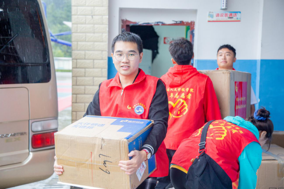 志愿者在金凤希望小学冒雨搬送爱心物资