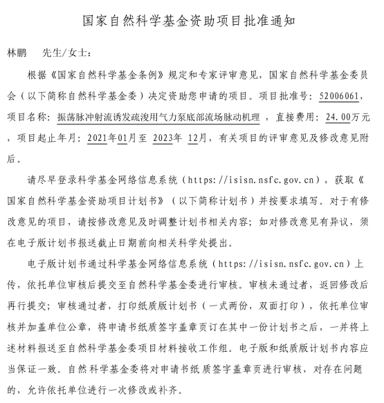 日前,国家自然科学基金委员会公布了2020年度国家自然科学基金立项资助名单,beat365能源与机电工程学院水射流团队林鹏博士主持的《振荡脉冲射流诱发疏浚用气力泵底部流场脉动机理》项目获批青年科学基金立项资助(项目编号:52006061,资助总金额24万元)。