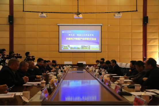 县长左志锋在讲话中对湖南人科技学院多年来对新化县人才培养、脱贫攻坚、全域旅游、经济社会发展等方面的大力扶持表示感谢,对学校建校以来所取得成绩表示赞赏。他指出,共建电陶产业学院,是新化做大做强电子陶瓷产业的一次重要发展机遇,新化县委、县政府将迅速成立领导小组,高位推动,定期调度对接,争取相关政策等多方面配合,全力支持电子陶瓷产业学院共建,并就共建工作明确了工作机构和时间要求;他表示,校政双方要以电子陶瓷产业学院组建为契机,进一步加强在文印产业、文化产业、农业产业、乡村振兴等方面合作。