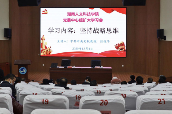 12月4日上午,校党委理论学习中心组在匠成楼报告厅举行扩大学习会议。中共中央党校创新工程首席专家任俊华教授作战略思维专题报告。党委书记郭军主持会议,在校的校领导、中层领导干部参加学习。