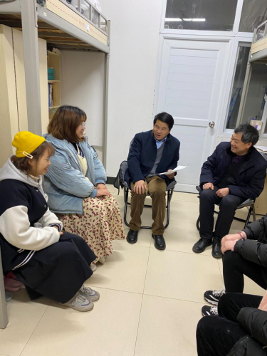 周发明在寝室和学生们亲切地拉起了家常。老家在哪里?学什么专业?生活习惯不习惯?学习压力大不大?老师的话能不能听懂?天气转凉了,冷不冷?今后对于职业有什么规划?……