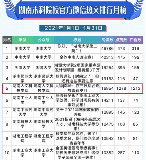 近日,湖南省教育厅官方微信公众号(湘微教育)发布了2021年1月湖南教育政务微信排行榜,其中beat365官微推文《人物|邓岭:在三尺讲台燃放青春岁月》以阅读数第五名,点赞数和在看数均为第一名的成绩,荣登湖南本科院校官方微信热文排行月榜。该文介绍了邓岭老师坚守教育初心,争做“四有”好老师的优秀事迹,邓老师以其恪尽职守的工作作风、严谨的治学态度、活泼的教学风格和感人的师生情打动了读者,激发了读者的情感共鸣。