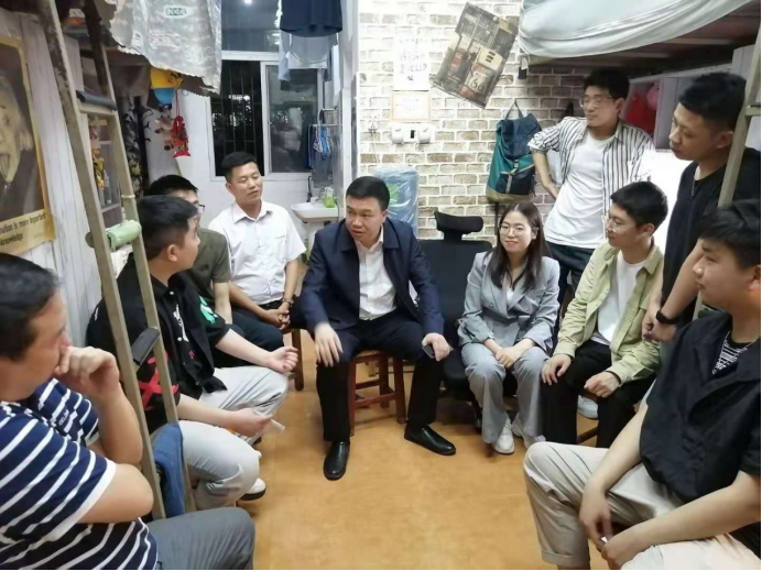 5月25日晚,校党委委员、副校长曹鑫率学工处、武保处负责人以及各学院党总支书记、副书记和辅导员深入2021届毕业生宿舍,亲切看望慰问即将毕业离校的2017级学生。