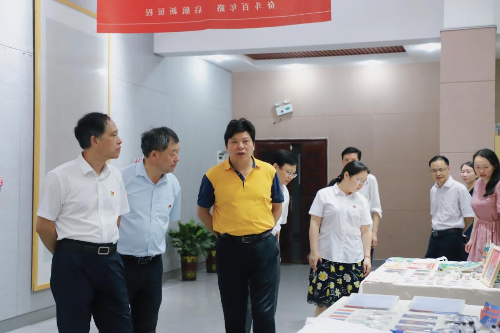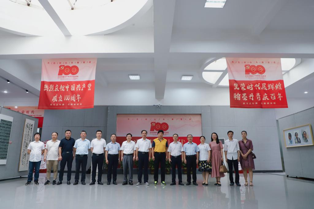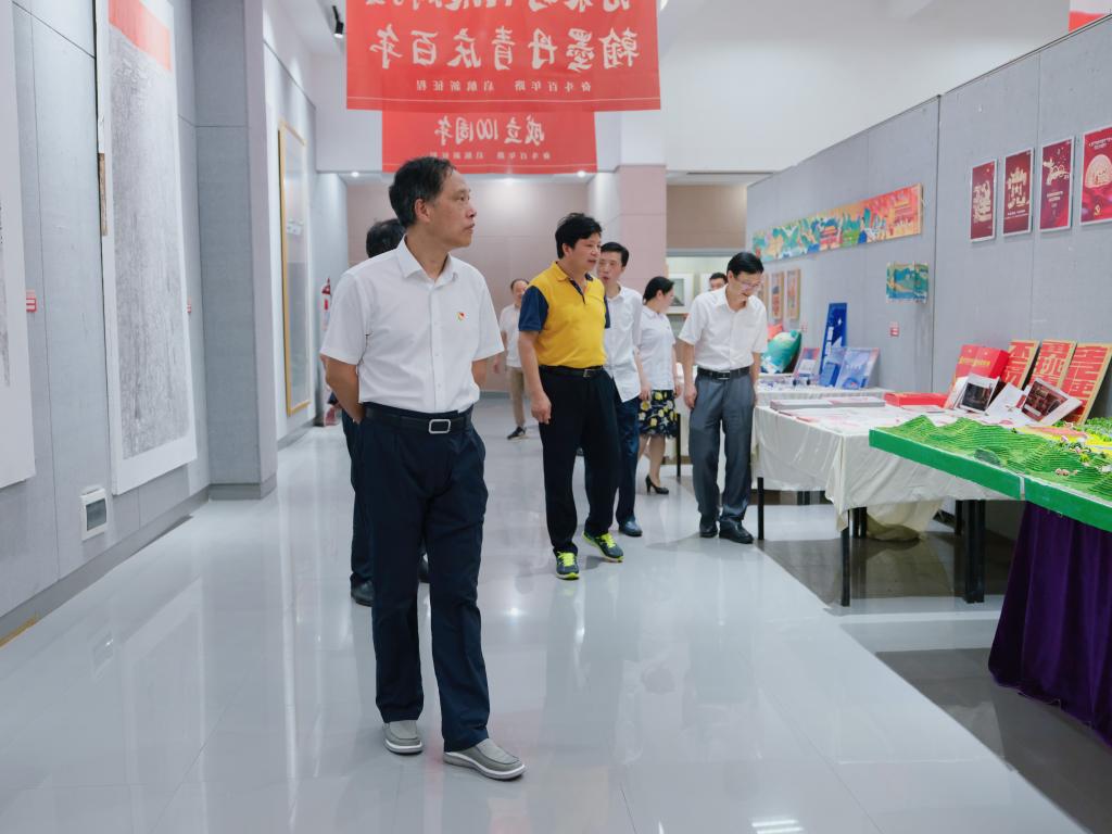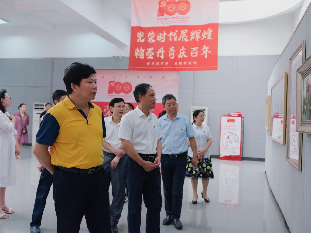 光荣时代展辉煌,翰墨丹青庆百年。在党的百年华诞即将来临之际,beat365“光荣时代”献礼建党百年书画与设计作品展盛大开幕。6月28日,校党委书记刘和云、校长刘铁铭、党委副书记李军林等全体在家校领导来到美术与设计学院展厅集体观展,宣传部、党政办等部门主要负责人陪同,美设院党总支书记谢光绎全程讲解。