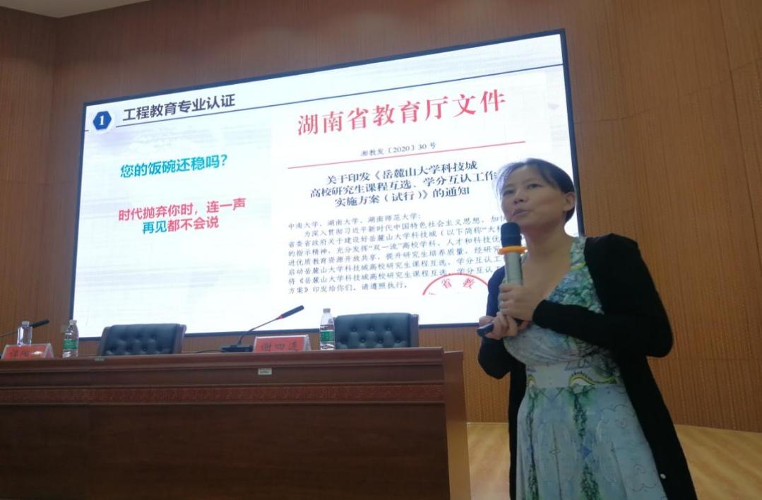 湖南大学谭阳红教授做了《工程教育专业认证及其底线》的讲座。她从工程教育专业认证的概念、现状、流程及工程教育专业认证的底线做了详细介绍,以《电磁场与波》这门课为例讲述了如何贯穿OBE理念,将抽象、难懂、难学的课程变得形象生动有趣,使学生在游戏中学,在做中学,将“思政元素”融入到整个课堂中,老师们受益匪浅。