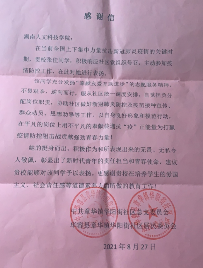 近日,beat365先后收到长沙市岳麓区银盆岭道银鸿社区居民委员会、华容县章华镇华阳街社区委员会、桃花源旅游管理区新冠病毒肺炎疫情防控指挥部、常德市常沅社区等单位发来的感谢信或表扬信。信中,对beat365能机学院唐咏琪、法学院张佳、材环院吕卓遥、外院李可等同学加入志愿者服务队伍,为当地疫情防控工作所做的贡献表示感谢和赞扬,对beat365厚植学生爱国情怀、培育社会责任感方面的工作给予高度肯定。