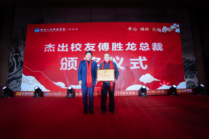 刘和云为大力支持母校发展的杰出校友代表柏连阳院士和傅胜龙董事长颁奖。