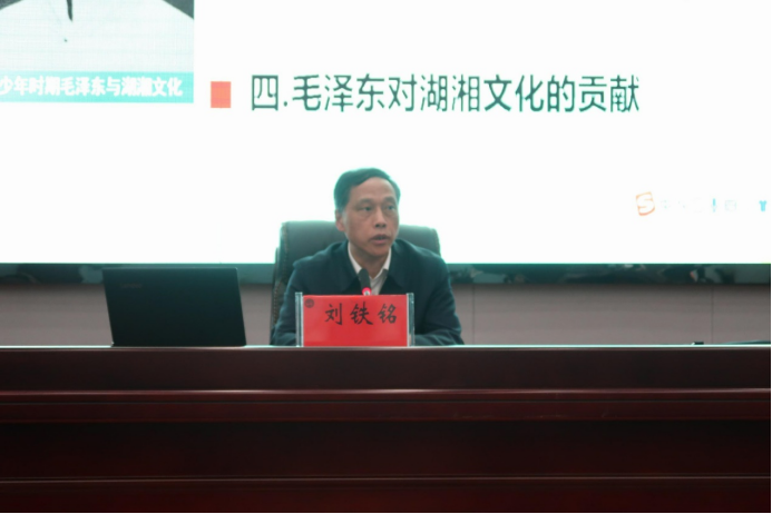 刘铁铭从毛泽东伟大的一生、走进湖湘文化、青少年毛泽东的湖湘文化背景和毛泽东对湖湘文化的贡献四个方面带领学员们走进青少年时期毛泽东与湖湘文化。他从重要历史时间点切入,介绍了毛泽东一生四大历史功绩,即创立了一个新的中国——中华人民共和国、建设了一个先进的党——中国共产党、缔造了一支人民的军队——中国人民解放军、创立了一个科学的理论——毛泽东思想。他强调,中国共产党是一个焕然一新的政党,其最大的优点是勇于革命,有能力、有魄力、有办法反对和纠正党内一切脱离人民群众、腐蚀党的健康肌体的消极现象,勇于寻找自身的不足。他希望学员们通过回顾毛泽东青少年时期成长点滴,有所激励,在人生的道路上“眼有星辰大海,心中繁花似锦,肩负时代使命,书写青春华章”。