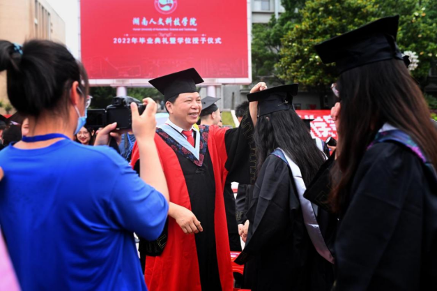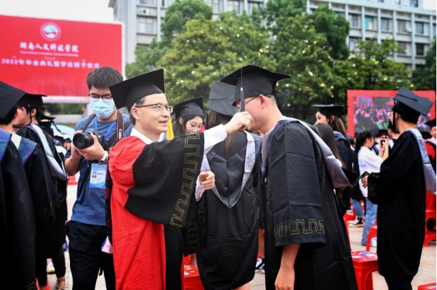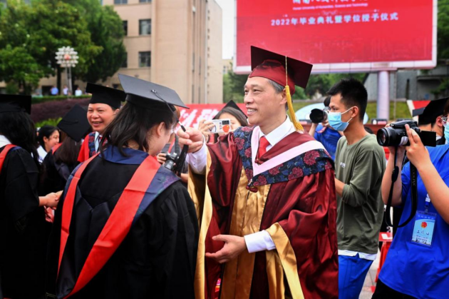 刘铁铭为14位2022届毕业生代表授予学位证书、毕业证书。全体校领导、学位评定委员会委员为毕业生代表正冠、拨苏。