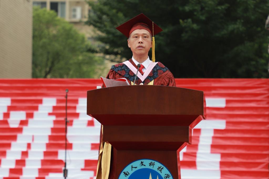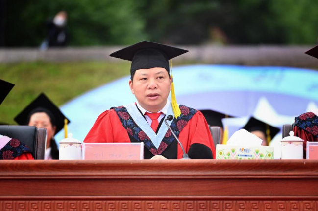校长、学位评定委员会主席刘铁铭致辞。他向顺利完成学业的同学们表示热烈祝贺,向辛勤培育同学们的师长致以诚挚的谢意和敬意。铁铭校长带领大家一起回顾了四年来在学校挥洒的激情与留下的足迹,感谢大家为学校发展做出的重要贡献。他以“担当”、“踏实”、“奋斗”三个关键词勉励毕业生,希望大家以“请党放心,强国有我”的主人翁精神,矢志不移,接续奋斗,以昂扬奋进的姿态在神州大地上书写下无愧于时代的壮丽篇章。刘铁铭强调,校友是学校宝贵的财富和资源,他饱含深情地说:“无论天涯海角,你们将是母校永远的牵挂!无论岁月更迭,母校将永远是你们坚强的后盾。希望大家继续关注支持母校的发展,常回家看看。”