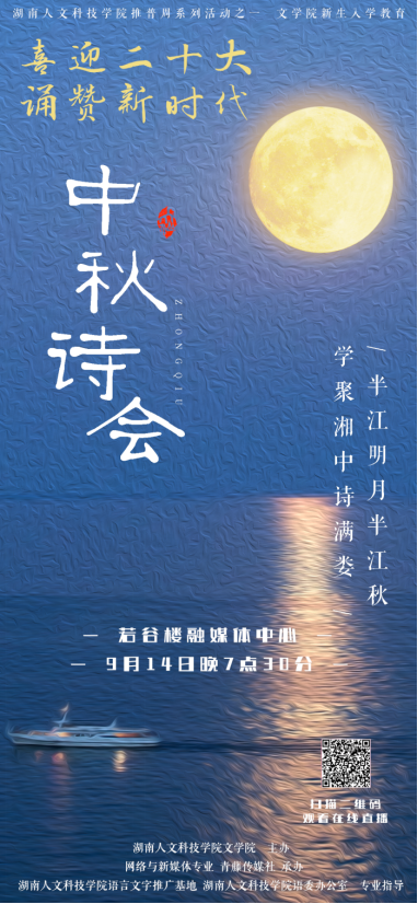 为大力推广和规范使用国家通用语言文字,提升师生语言能力,传承发展中华优秀传统文化,本届推普周主题活动以“喜迎二十大,诵赞新时代”中秋诗会的形式进行,得到湖南省语言文字推广基地和校语委办的精心指导。诗会在网络与新媒体专业学生及青藤传媒社成员的技术支持下采用现场直播的形式全程推流至云端,让全体师生共享一场诵读经典的视听盛宴。