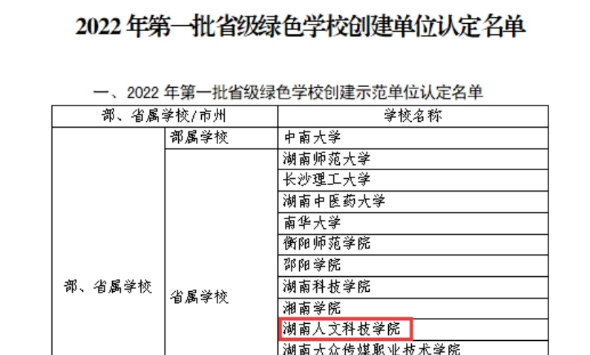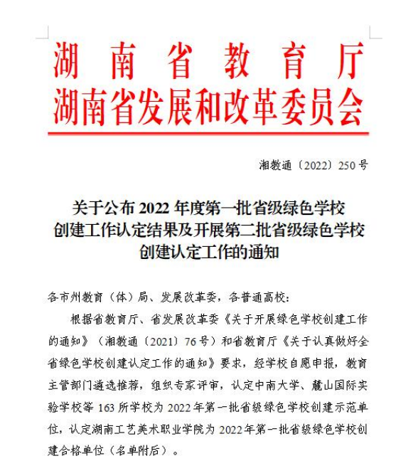 近日,湖南省教育厅、省发展改革委发布《关于公布2022年度第一批省级绿色学校创建工作认定结果及开展第二批省级绿色学校创建认定工作的通知》(湘教通〔2022〕250号),beat365被评为2022年第一批省级绿色学校创建示范单位,为全省获此殊荣的9所高校之一。