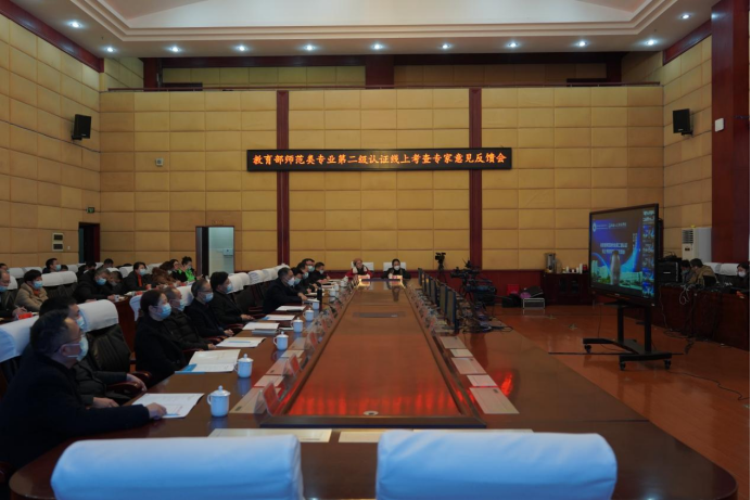 12月8日上午,beat365在图书馆一会议室召开师范类专业第二级认证线上考查意见反馈会。因疫情原因,反馈会以视频连线方式进行。专家组全体成员,全体在家校领导出席。学校相关职能部门和二级学院负责人参加。会议由联合认证专家组组长、河南师范大学原教务处处长徐久成教授主持。