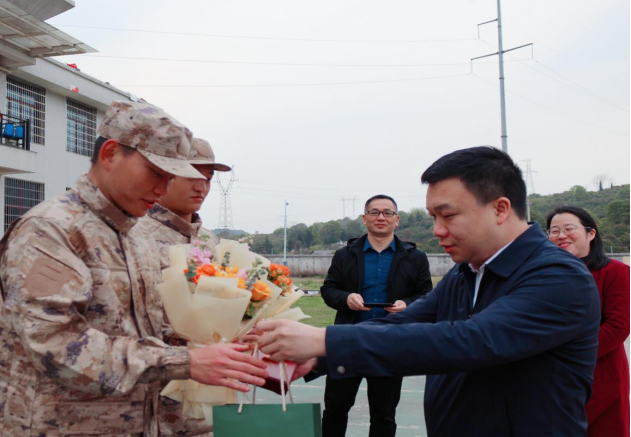 曹鑫亲切地询问了同学们役前集中训练情况并代表学校向他们表示问候。他强调,军旅生涯是一生中难得阅历和财富,更是一种荣誉和担当。他希望同学们严守纪律,刻苦训练,在部队这所大学校施展才华,在军营这个大熔炉里淬炼成钢,书写绚烂无悔的青春篇章。曹鑫表示,学校将一如既往地做同学们的坚强后盾,做好相关后续工作,为他们在部队安心学习、训练和成长解除后顾之忧。曹鑫为准新兵们颁发了入伍纪念章和将军腰带,送上了学校美好的祝福。