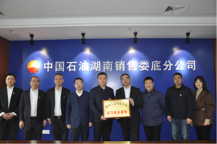 会后,双方签订了实习就业基地协议,曹鑫代表学校向中国石油湖南销售娄底分公司授“实习就业基地”牌。