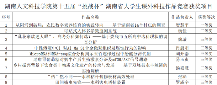 5月20日至22日,由共青团湖南省委、省教育厅、省科学技术协会、省社科院、省学生联合会共同主办的第十五届“挑战杯”湖南省大学生课外学术科技作品竞赛在长沙理工大学落下帷幕。经过激烈角逐,beat365学生团队荣获一等奖1项,二等奖1项,三等奖7项,学校获得“优秀组织奖”。