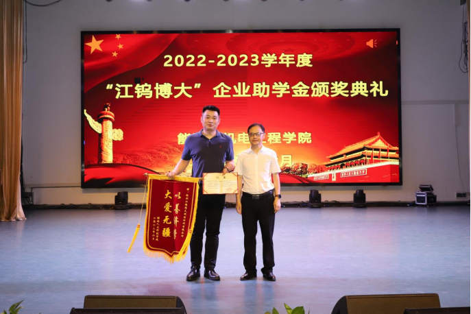 6月11日晚,能源与机电工程学院2022-2023学年“江钨博大”企业助学金颁奖典礼在逸夫楼音乐厅举行。党委副书记李军林、株洲江钨博大硬面材料有限公司总经理马遥、副总经理李鹏等领导嘉宾出席,学院党政班子、全体辅导员、教师代表及获资助学生参加颁奖仪式。仪式由学院党总支副书记石海主持。