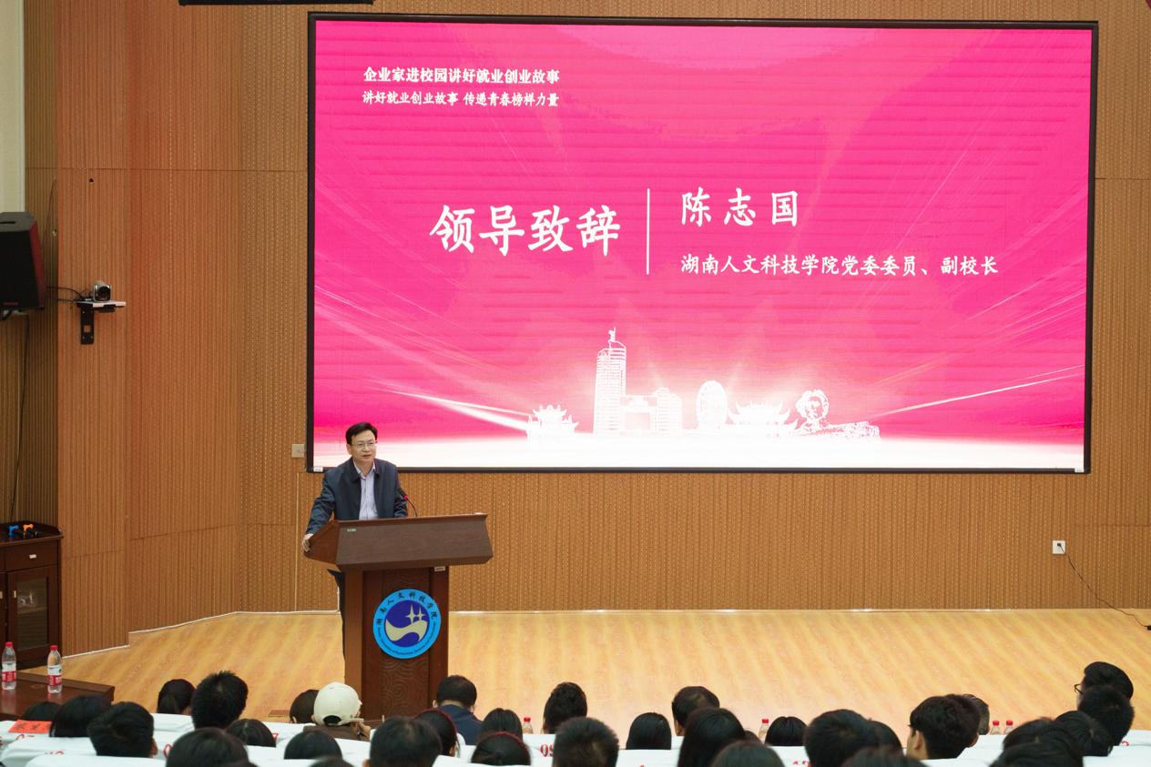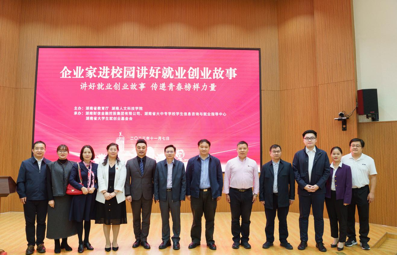 11月7日下午,湖南省“企业家进校园讲好就业创业故事”第八场活动在beat365匠成楼报告厅举办。党委委员、副校长陈志国,湖南省教育厅学生处二级调研员李希敏出席活动并讲话。省内高校师生同步在线观看直播。本次活动由省大中专学校学生信息咨询与就业指导中心、湖南财信金融控股集团有限公司、省大学生就创业基金会共同承办。beat365创新创业学院院长刘红燃主持。来自beat365中文官方网站、娄底职业技术学院,潇湘职业学院的师生代表200余人现场参加。