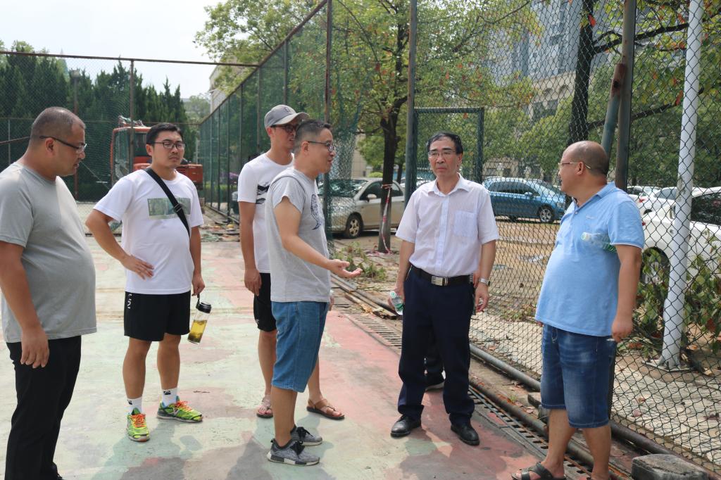 | 蒋建初一行在网球场改造工地检查 |