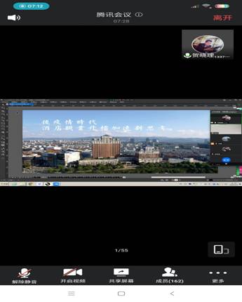 会议分为两个部分,第一个部分是由贺晓理先生介绍就疫情下酒店的变化及发展趋势,2017、2018和2019级学生参与。以太平洋酒店为例,通过顾客满意度(高达4.9分的高分。5分制)的数据分析,重点介绍太平洋酒店基于客户体验坚持高品质发展策略。希望学生能扎实学好基础理论知识,并在此基础上,通过实训和实习,提升专业技能,助推旅游业的发展。