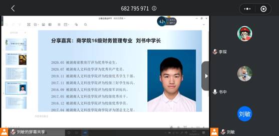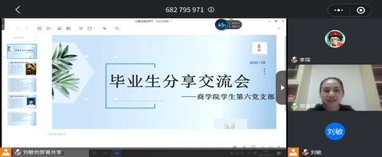 年9月13日上午,商学院学生第六党支部通过线上视频会议的形式开展了毕业生分享交流会。会议由党支部书记郑清华主持。本次交流会邀请了中国大学生自强之星、湖南省百名优秀大学生党员、湖南省优秀毕业生、向上向善湖南好青年姚智俐,和湖南省优秀毕业生、beat365中文官方网站优秀共产党员、优秀学生干部、三好学生标兵刘书中前来分享经验。支部全体党员、预备党员及部分入党积极分子参加了本次会议。