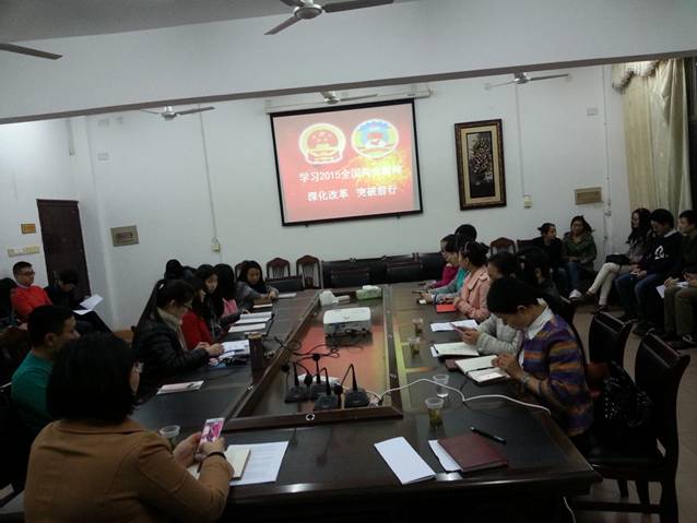 会议由谢金铃向大家详细介绍了两会精神和两会的十大亮点。李克强总理的政府工作报告中提到的今年经济社会发展的主要预期目标是,国内生产总值增长7%左右,居民消费价格涨幅3%左右。新常态下的中国经济更加注重质量,适度下调经济增长目标,把更多的精力从稳增长转向调结构、促转型和深化改革开放。毕业生党员们结合自身实际表达了对两会相关问题的思考,党员同学们围绕着:“高校毕业生创业、就业”“如何抑制房价过快上涨、健全住房保障体系”“党风廉政建设”等问题进行了学习讨论交流互动。通过组织活动加深学生党员对“两会”的了解,提高学生党员对时事的关注力度,让大家全方位了解我国经济社会发展。