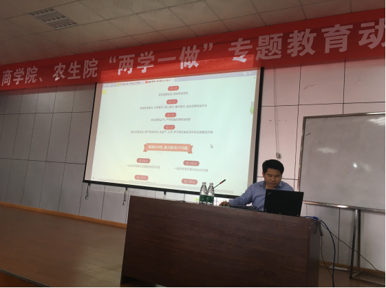 周发明副校长为院商学院师生党员讲授的“两学一做”专题党课,农生院的师生党员也参加了听课。(刘辛田、刘红燃)
