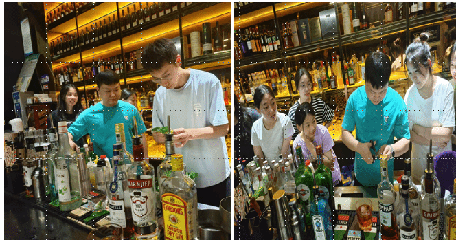 本次校企合作由汐格总经理刘金金女士接待,店长陈南塘先生进行酒店数字化运营、酒水知识讲授和现场操作展示教学。技艺精湛的调酒师为我们表演了绚丽的花式调酒技术,并现场教学了“红粉佳人”、“自由古巴”、“玛格丽特”、“莫吉托”、“特基拉日出”等知名鸡尾酒的调制方法。同学们在惊艳于调酒师高超技艺的同时,都跃跃欲试,在老师的悉心指导下,亲手调制出了属于自己第一款鸡尾酒,获得高度认可,全场氛围十分活跃。