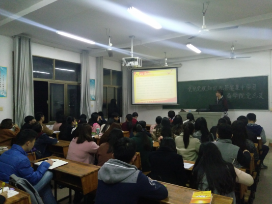 2016年11月6日19:30分在同德楼601顺利进行。党总支副书记刘红燃为本次比赛致辞,预祝各位选手赛出风采。比赛共分为两轮,第一轮由6个支部代表队进行比拼,最终财务管理学生第一党支部,市场营销学生党支部,人力资源管理学生党支部分别获得一、二、三名。第二轮比赛由各支部挑选优秀个人进行混搭,分为3组进行,经过紧张而精彩的比赛,最终,欧阳钰娃、阳孟媛、黄赞扬、陈植、张帅五位选手脱颖而出,被推选参加学校复赛。