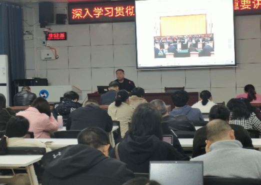 325党总支书记刘辉在高韵楼101以“深入学习贯彻习近平总书记湖南重要讲话精神 坚定不移沿着习近平总书记指引的方向前进”为题,为商学院全体院领导、教研主任、三办主任、内设党支部书记、班主任、辅导员作专题辅导报告。