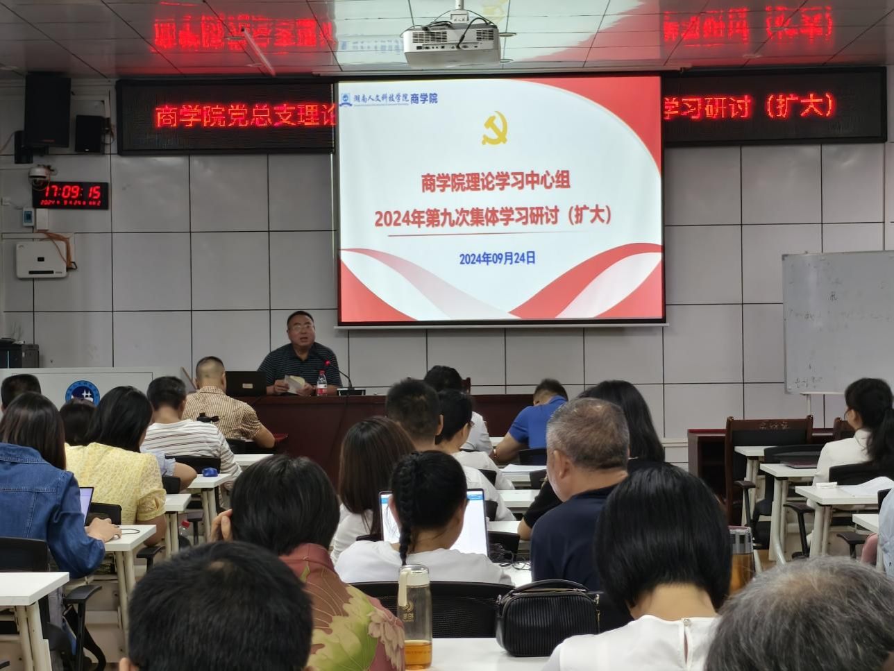 9月24日下午,商学院党总支理论学习中心组(扩大)在高韵楼101室开展2024年第九次集中学习研讨,全体教职员工参加,党总支书记刘辉主持。