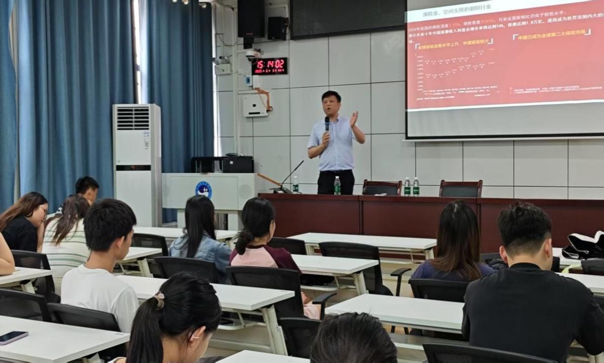 6月5日下午,商学院于高韵楼101成功举办中国人保专场招聘宣讲会。活动吸引了商学院、数学与金融学院共70余名学子踊跃参与。中国人保寿娄底城区本部负责人周伟担任主讲,为同学们带来一场干货满满的行业分享与招聘宣讲,为有志投身保险行业的求职者打开全新职业发展大门。