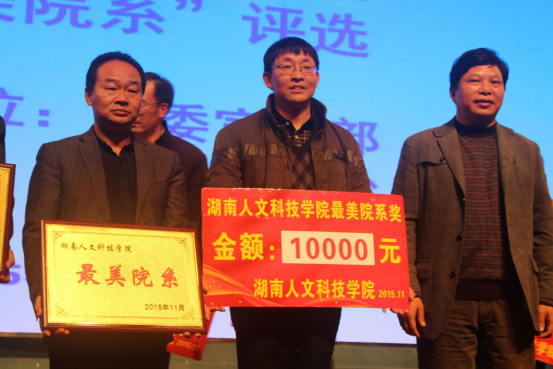 首先,校长刘和云为“最美院系”活动的评选致辞,强调beat365各系转型发展的优势,并宣布“最美院系”活动现场展示正式开始。接着13个院系老师纷纷上台展示各自的风采。我系由辅导员谢丽老师上台展示,她从党建工作、教学科研、学生管理与招生就业四个方面向大家展示了最美经管系风采。她介绍了近年来我系在各方面均取得了喜人成果,领导班子精诚团结、师生关系融洽和谐、学生学习氛围浓厚、学习环境整洁温馨,并表示年轻的经管系必将锐意进取,再创辉煌。谢丽老师的精彩阐述赢得了现场阵阵欢呼,最终我系凭借极具感染力的现场展示以及10000余票的网络微信投票数被评为首届“最美院系”,校党委书记郭军和校长刘和云为我系颁奖。