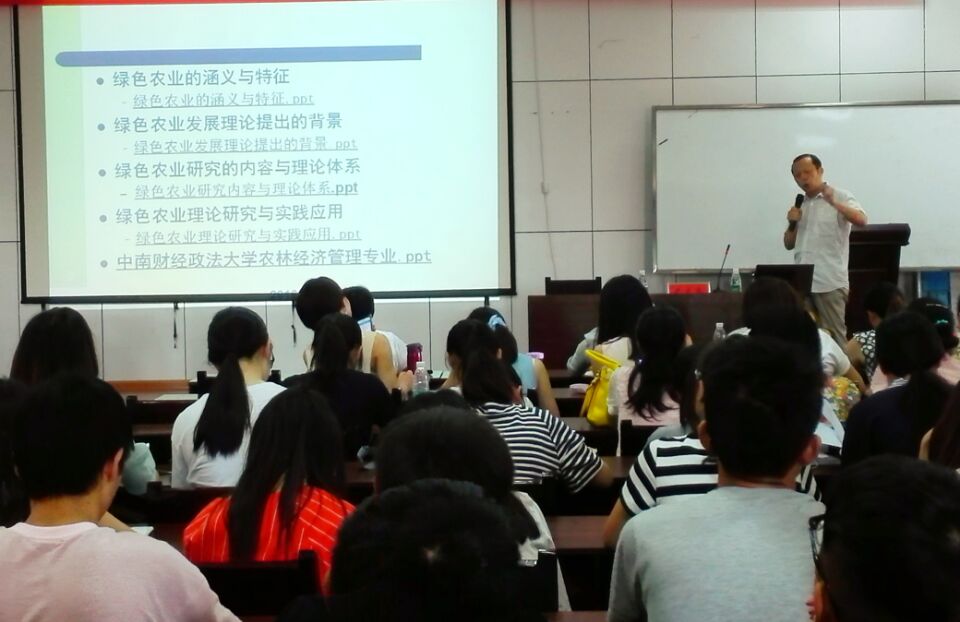 严教授的讲座内容包括四个部分:首先,严教授介绍了绿色农业的涵义与特征、绿色农业发展理念提出的背景;其次结合案例阐述了绿色农业研究的内容与理论体系,绿色农业包括绿色农业和环境、林业、畜牧业、土地、农业基础设施建设、农业生产技术等;在绿色农业理论研究及在实践中的应用中,严教授特别提出了绿色农业发展的实践模式:主要集中在“两减两增两低两高一化”的示范推广应用上,即通过减化肥、减农药,增产量、增效益,低能耗、低排放,高品质、高安全,国际化来实现绿色农业的生态、经济和社会效益,以保证现代农业的健康运行与可持续发展。最后,严教授简要介绍了中南财经政法大学农业经济管理学科,并对在座师生开展科学研究和研究性学习提出了很多很好的建议。