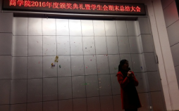 201713日晚7:30分,商学院在匠成楼报告厅隆重举行2016年度颁奖典礼暨学生会期末总结大会,与会人员有商学院党总支刘红燃副书记、学工办全体辅导员老师以及2016届全体学生干部、获奖运动员、优秀班集体和先进个人。
