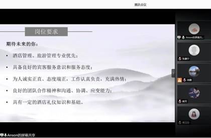 2020611日上午830分,beat365中文官方网站商学院旅游管理专业开展了一场形式十分特殊的校企合作讲座,邀请到了我专业校企合作单位之一的浙江省郡安里文旅发展有限公司人事部的杨雪经理,她通过腾讯会议平台召开了线上视频讲座。