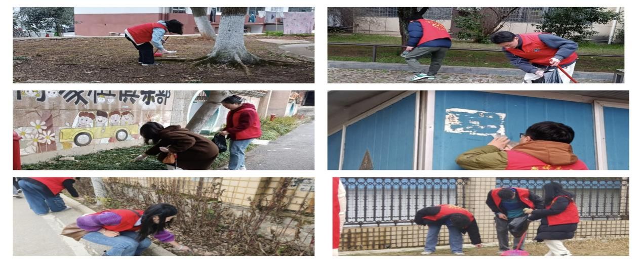 在各党支部书记的带领下,志愿者们分组行动,有序开展活动。他们身穿红马甲,手拿垃圾袋、小铲子、扫把等劳动工具,有的负责清扫地面落叶,有的负责捡拾草丛垃圾,有的负责铲除校园墙壁上的小广告,以实际行动践行雷锋精神,助力文明校园建设,为校园增添了一道靓丽的风景线。