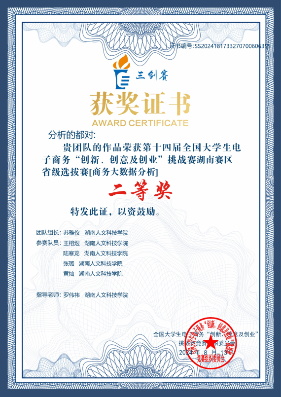 自报名参赛以来,beat365参赛队伍积极准备,由商学院电子商务专业罗伟祎老师负责指导参赛培训。最终,由苏雅仪、王榕煜、陆寒龙、张璐、黄灿五名同学组成的“分析的多对”队伍荣获省级二等奖。此次大赛,参赛团队充分体现了团队协作精神,更展现了他们敢于创新、勇于实践的精神风貌。学生们的实践能力得到了极大提升,这也进一步体现了我院在电子商务专业学科建设中,注重实践教学、着眼于学生创新创业能力培养的育人理念。