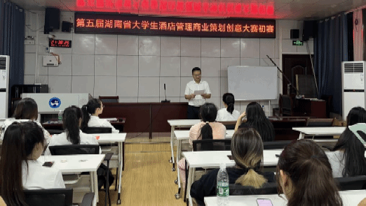 根据湖南省教育厅《关于举办第五届湖南省大学生酒店管理商业策划创意大赛的通知》精神,为进一步强化旅游管理专业实践教学环节,培养学生思维能力、研究创新能力、实践应用能力和团队协作精神,提升专业综合技能,选拔优秀团队参加湖南省教育厅即将举办的第五届湖南省大学生酒店管理商业策划创意大赛,7月2日,商学院旅游管理专业在高韵楼101举行校内预选赛现场展示。