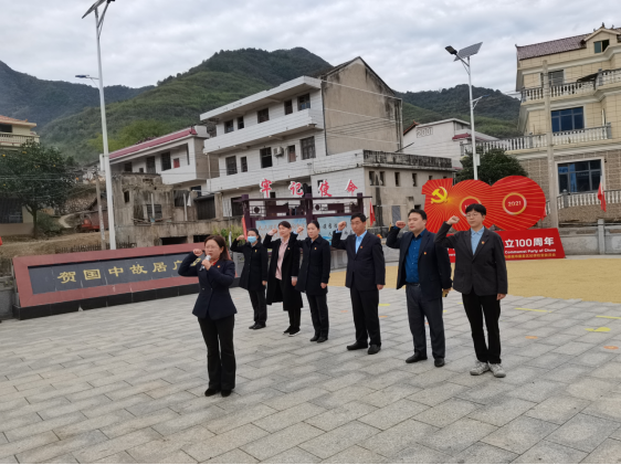 在贺国中故居广场,全体党员庄严列队。在贺国中铜像前集体三躹躬寄托对革命先烈的追思,深切缅怀革命先烈的丰功伟绩。随后,在凌艳平领誓下,全体党员面向党旗举起右拳,重温入党誓词,进一步坚定理想信念。走进贺国中故居,全体党员认真聆听工作人员讲解,观看贺国中英雄事迹视频《一张旧照片的故事》,详细了解了红军“虎将”短暂而又不平凡的一生。透过一张张饱含历史印记的图片和文物,全体党员追忆贺国中同志的生平事迹,深刻感受他坚定的革命信仰和对党忠诚、不怕牺牲的大无畏革命精神。