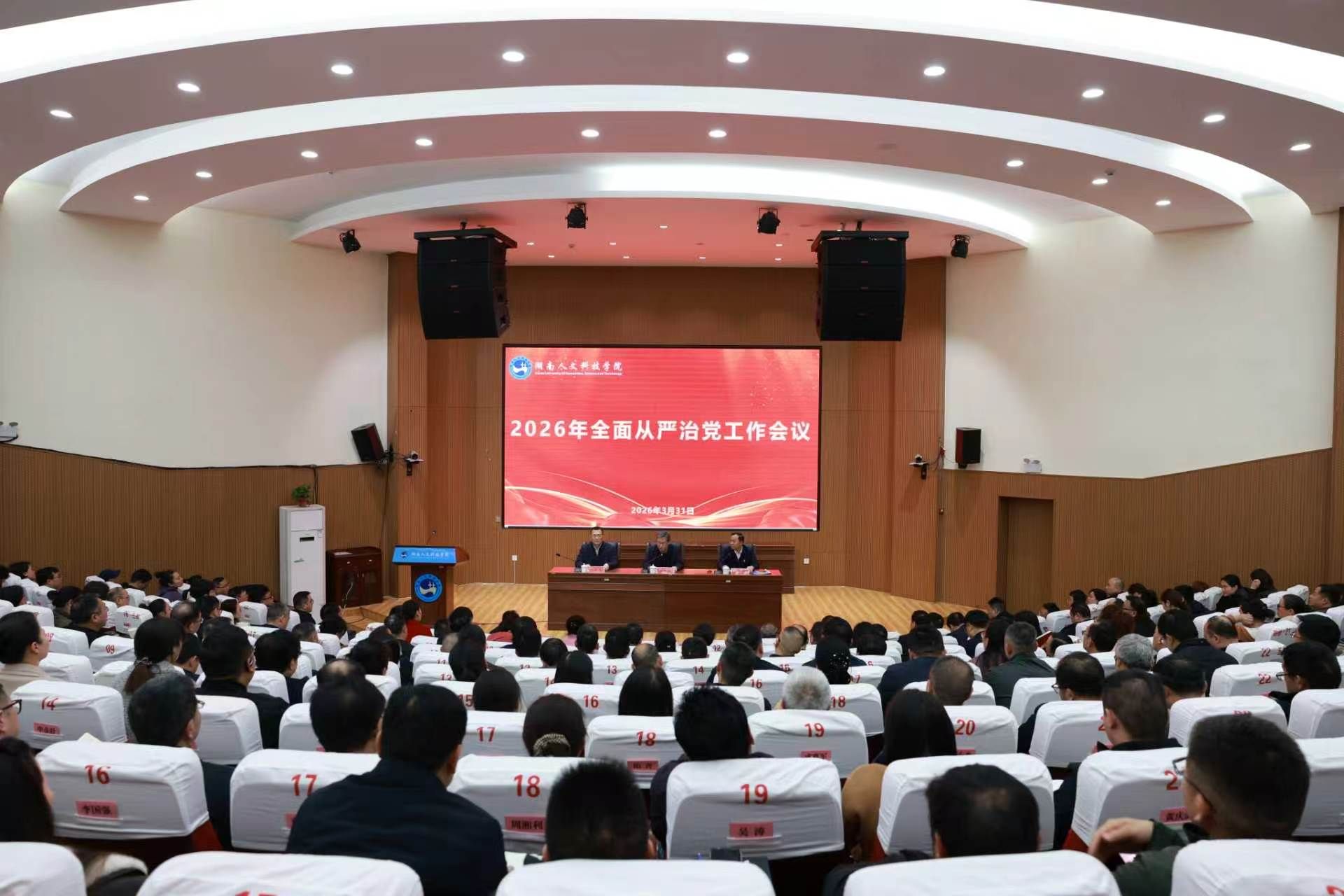 3月31日,学校在匠成楼报告厅召开2026年全面从严治党工作会议,深入学习贯彻习近平总书记在二十届中央纪委五次全会上的重要讲话和全会精神,总结过去一年学校全面从严治党工作,部署2026年工作重点任务。会议由学校党委书记胡凯波主持。学校党委委员、纪委书记、省监委驻学校监察专员胡立民作学校纪检监察工作报告。娄底市纪委分管日常工作的副书记、市监委副主任刘爱军出席会议并讲话。全体在校校领导、校纪委委员和全校副科及以上实职干部、教研室主任、实验室主任、特约监督员参加会议。