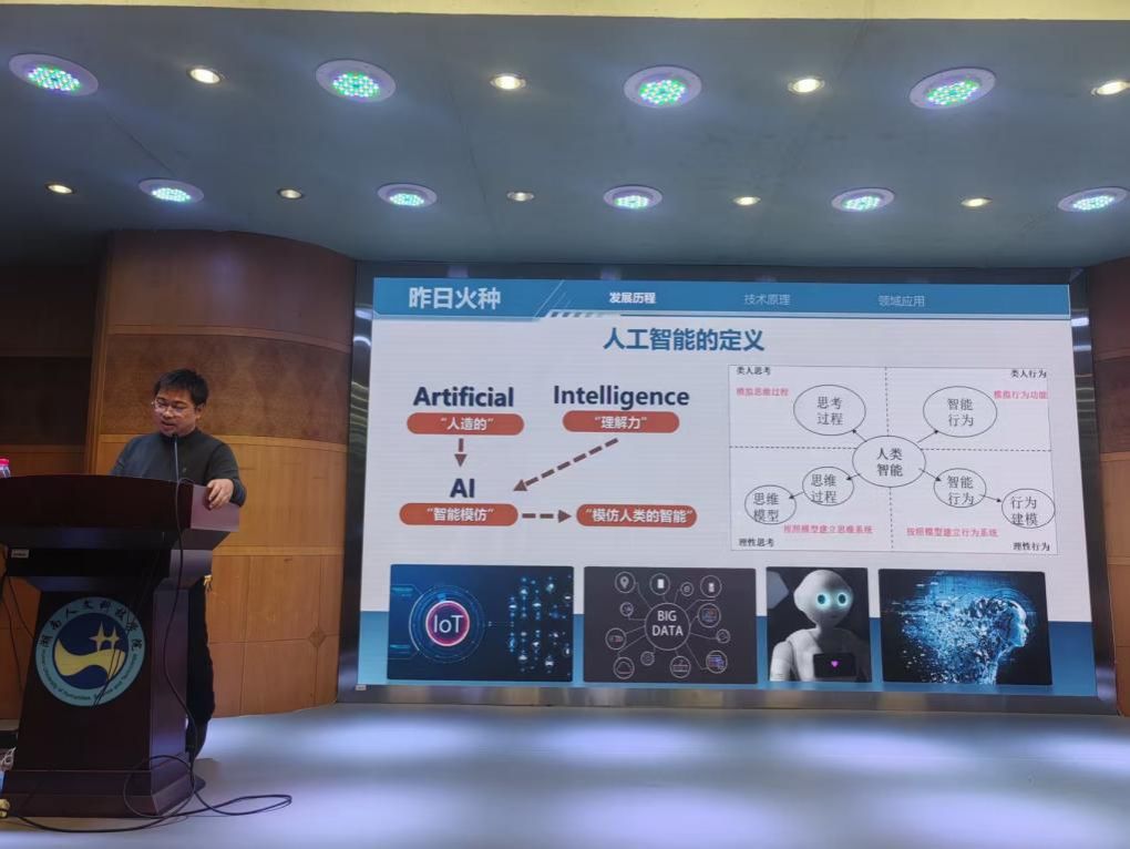 周彦首先简要介绍了湘潭大学自动化与电子信息学院的学科专业建设情况及硕士研究生招生政策,并向我院学子发出升学深造的诚挚邀请。重点围绕“人工智能(AI:Artificial Intelligence)”这一主题,从AI的发展历程、技术原理和领域应用展开报告,报告内容充实,案例生动,语言通俗易懂。本场报告不仅拓宽了师生的专业知识和学术视野,也进一步激发了同学们投身AI学习的兴趣与热情。