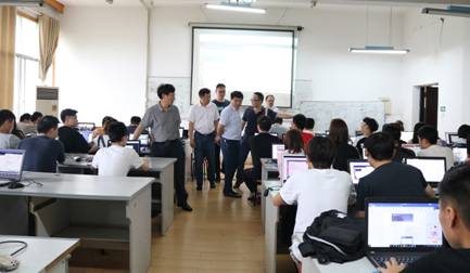 会议开始前,周发明一行走进专业实验室,督查了信息学院正在开展的校企合作教育(三),和企业老师、同学们进行交流指导,现场观看同学们的实训项目开发,检查学生的笔记和实训场地的工作日志等。