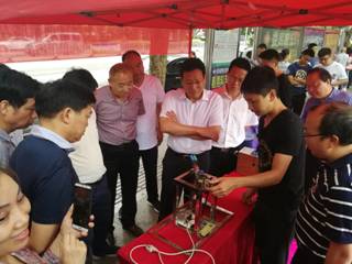 beat365中文官方网站信息学院于5月22日上午参加了本届的科普宣传活动。在活动中,信息学院共展出了全国大学生电子设计竞赛国家一等奖的作品、二等奖的作品以及其他设计作品共10余件,参展的作品均为我院学生动手制作完成。娄底市委华学健副书记以及娄底市科技局领导莅临我们展位参观指导。华副书记观看了我们的作品演示,对我院学生的创新实践能力给予了鼓励和赞赏,希望今后制作出更多更加精良的作品,为强国富民、科技创新贡献更多的力量。