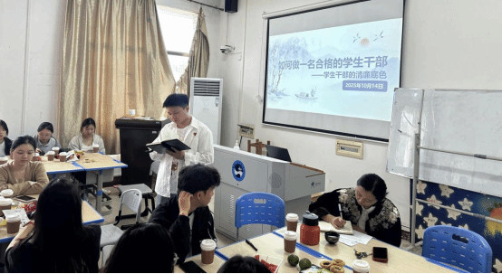 会上,朱舒腊“清廉校园” 理论内涵,从价值引领、制度固廉、监督护廉等维度展开讲解,强调要将 “清白做人、干净做事” 的理念融入团学工作全流程,以制度规范权力运行,让 “廉” 成为团学文化的精神基因;代鑫龙则围绕《信息学院团学干部廉洁自律行动公约》,重点解读 “初心立廉、议事守廉、用权护廉” 等核心要求,明确团学干部需杜绝 “官僚气”“一言堂”,在评优评先、经费使用等敏感工作中严守公平底线。他们共同要求全体学生干部以 “修身养廉” 强化自我约束,以 “协作传廉” 凝聚团队合力,将廉洁要求转化为服务同学的实际行动,为团学工作筑牢 “廉防线”。