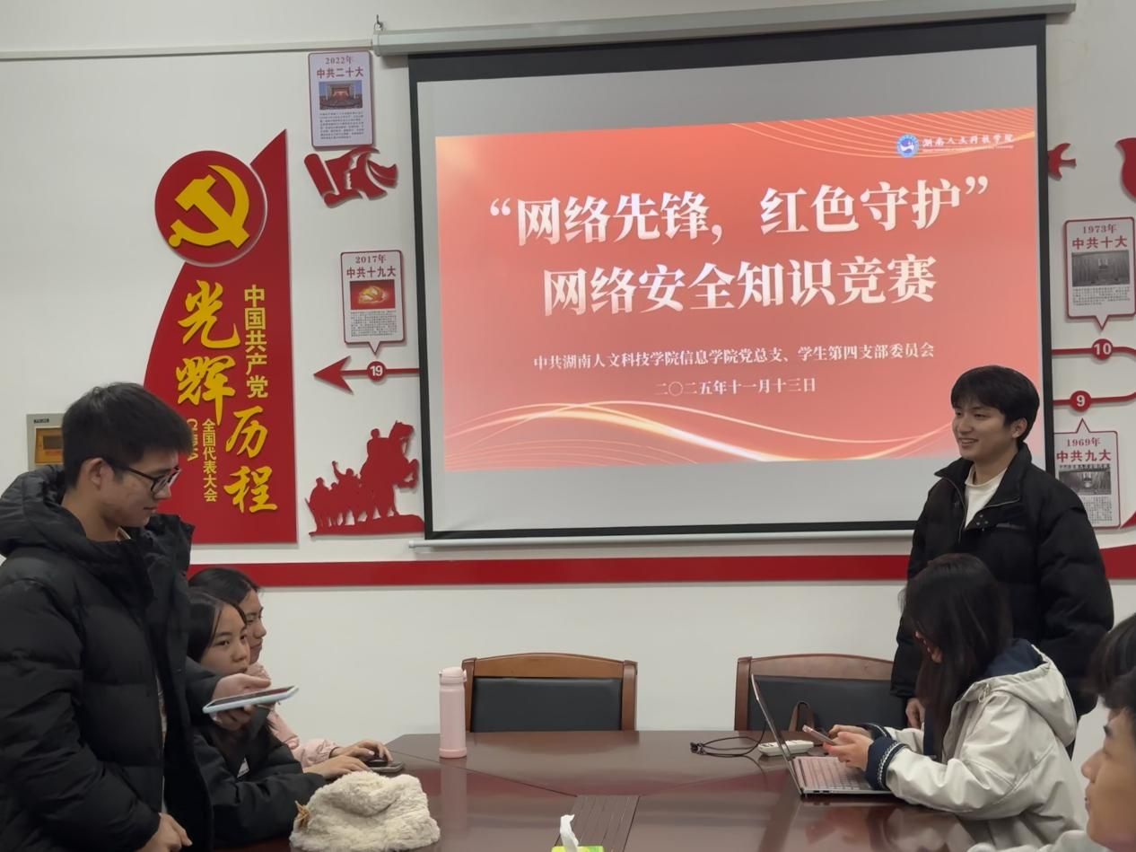 为积极响应国家网络安全号召,提升学生的网络安全意识和专业技能,2025年11月13日晚,由中共beat365中文官方网站信息学院学生第四党支部开展的“网安先锋,红色守护”网络安全知识竞赛在百全楼313教室成功举行。本次活动面向信息学院全体学生,旨在普及网络安全知识,筑牢校园网络安全防线。