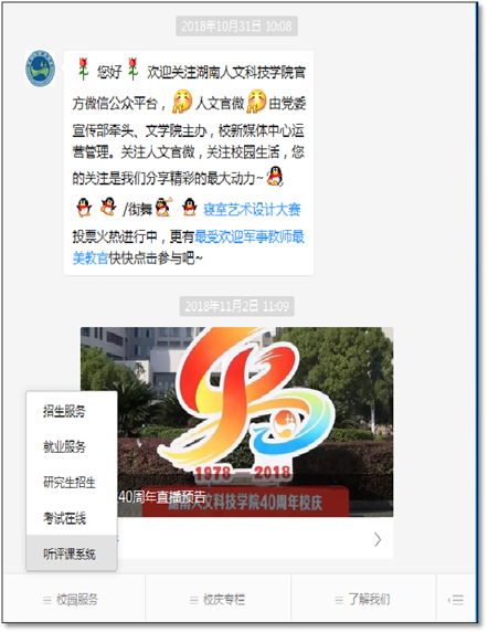 手机端操作: 连接校园无线wifi (学校wifi: HUHST)---进入微信---订阅号---beat365中文官方网站微信公众号---校园服务---听评课系统(如下图)。登录系统:用户名和密码都是本人工号。