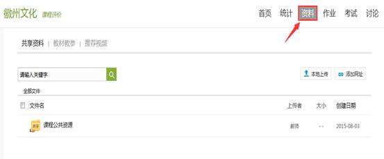 共享资料界面如下,这是一个师生共享的平台,同学们可以本地上传资料与同学共享,可查看老师和同学上传的共享的资料,资料较多难以查阅时也可以进行关键词检索。