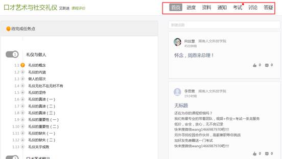 D、 空间中还包括了统计,资料,作业,考试和讨论功能。在界面右侧,同学们可以参与讨论,查看通知,查看同学,下面分别进行介绍。